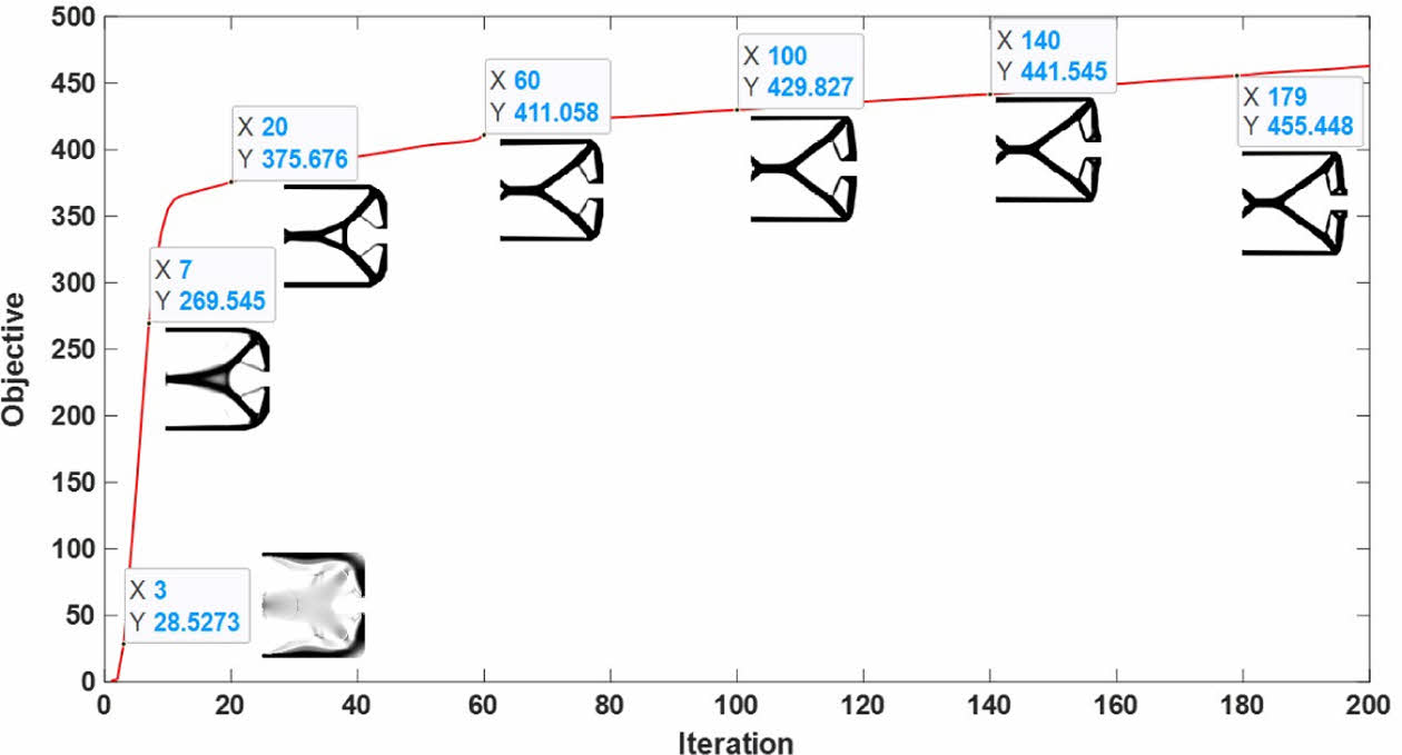 길이마다 100개의 요소로 구성된 정사각형 영역이 고려되었으며, 대칭성을 이용하여 구조물의 상단 절반만을 최적화 대상으로 설정하였다. 오른쪽 끝에 위치한 이동 가능한 물체는 가상 스프링 기법(fictitious spring method)을 통해 구현되었다. 스프링 상수는 0.005로 설정되었으며, 이는 작은 값이지만 물체 근처에서의 재료 제거를 효과적으로 방지하기 위해 선택되었다[7].