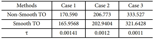 또한, Table 2에 제시된 t 값은 매끄러운 위상 최적화와 매끄럽지 않은 위상 최적화 간의 설계 충실도를 평가하는 중요한 지표로 활용된다. t 값은 Case 1에서 0.00141, Case 2에서 0.0012, 그리고 Case 3에서 0.0011로 점차 감소하는 경향을 보인다. 이는 이방성이 강할수록 매끄러운 설계와의 차이가 줄어들며, 매끄러운 설계가 이방성 재료의 특성을 효과적으로 반영하고 있음을 시사한다. 특히, t 값이 낮을수록 매끄러운 설계가 요소 기반 설계와 더 높은 충실도를 가진다는 점에서, Case 3에서의 낮은 t 값은 강한 이방성 조건에서도 설계의 정밀도가 유지됨을 보여준다.
