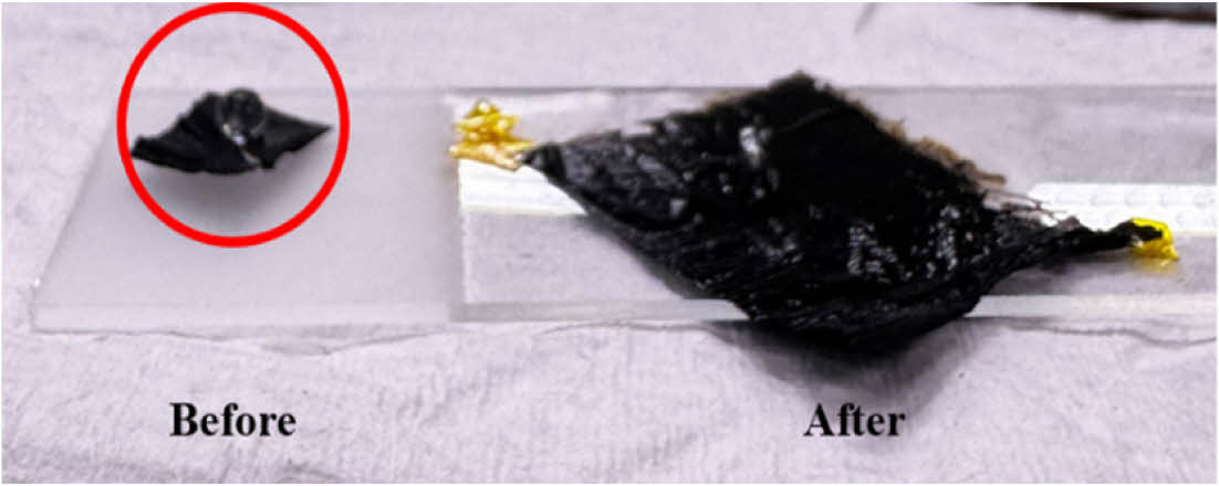 Fig. 2는 산소 플라즈마 처리 전, 후의 탄소나노튜브 시트에 초순수를 떨어뜨린 실험결과이다. 이는 표면의 산소관능기에 의해 탄소나노튜브로 초순수가 흡수되는지를 확인하기 위해 진행하였다. 그 결과 플라즈마 처리 전 탄소나노튜브 시트는 초순수가 침투하지 못하여 물방울의 형태를 유지하는 반면에 플라즈마 처리 후 탄소나노튜브 시트는 초순수가 침투하여 완전히 스며든 것을 확인하였다. 이러한 결과를 통해 산소 플라즈마 처리 후 표면에 산소관능기가 형성되고 이를 통해 탄소나노튜브 시트가 소수성의 특성에서 친수성으로 변화한 것을 알 수 있다.