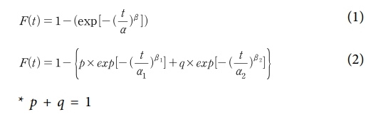 유리섬유 인장강도의 척도모수와 형상모수를 계산하기 위해 유니모달과 바이모달 와이블 분포를 이용하여 분석하였다. 유니모달(1) 및 바이모달(2) 와이블 식은 아래와 같다.