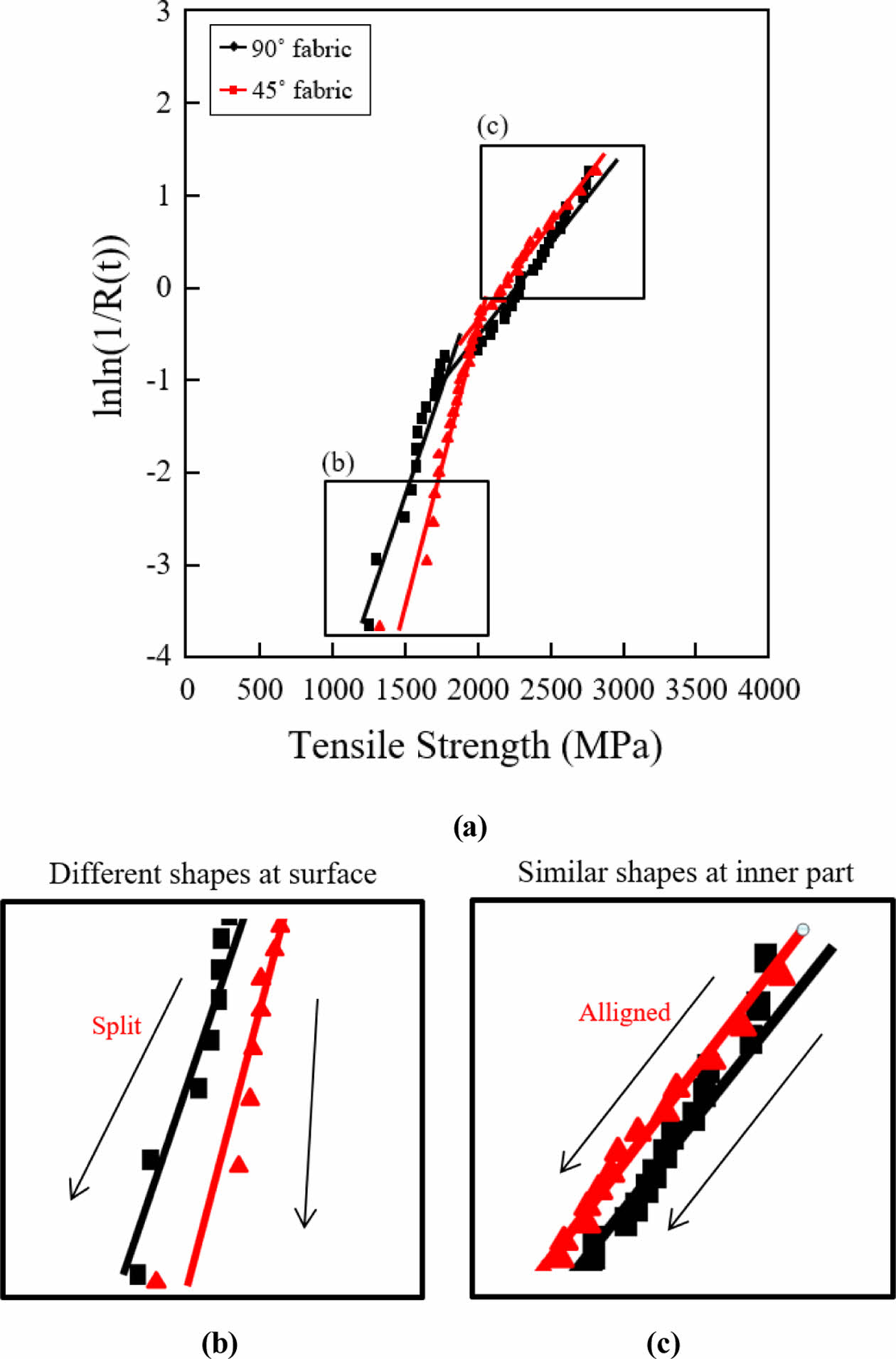 Fig. 4 Weibull distribution of glass fiber tensile strength: (a) Weibull distribution; (b) weak section; and (c) strong section |