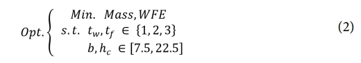 반사경의 목표 함수인 질량과 파면 오차(WFE)는 본질적으로 상충 관계에 있다. 한 가지를 최적화하면 다른 한 가지가 희생되기 마련이며, 두 목표를 동시에 최적화하는 최적 솔루션을 도출하는 것은 어렵다. 이러한 문제를 해결하기 위해, MOPSO 알고리즘을 활용한 다목적 최적화가 수행되어 파레토 전선 상의 최적 솔루션을 식별한다. 탄소 섬유 복합재 비구면 반사경의 최적설계는 식 (2)에 제시되어 있다.