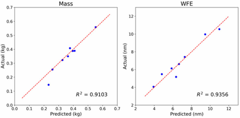 실험계획법을 통해 설계 변수 범위 내에서 직경 200mm 탄소 섬유 복합재 비구면 반사경에 대해 31개의 실험점이 생성되었다. 각 실험점 데이터로 FEA를 수행하여 질량과 WFE 값을 계산하였으며, 이는 Table 3에 제시되어 있다. 이러한 값을 기반으로 질량과 WFE에 대한 크리깅 메타모델이 생성되었다. Fig. 7에 나타난 바와 같이, 질량과 WFE의 R2 값은 각각 0.9103과 0.9356로, 두 값 모두 0.9 이상을 보여 메타모델의 정확도가 허용 가능한 수준임을 확인하였다.