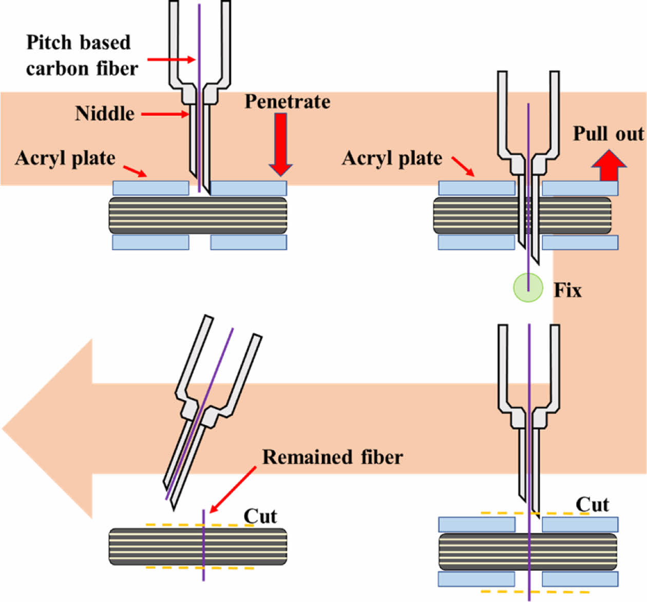 Fig. 2 Stitching process to insert pitch-based carbon fibers using a needle and acrylic plate |