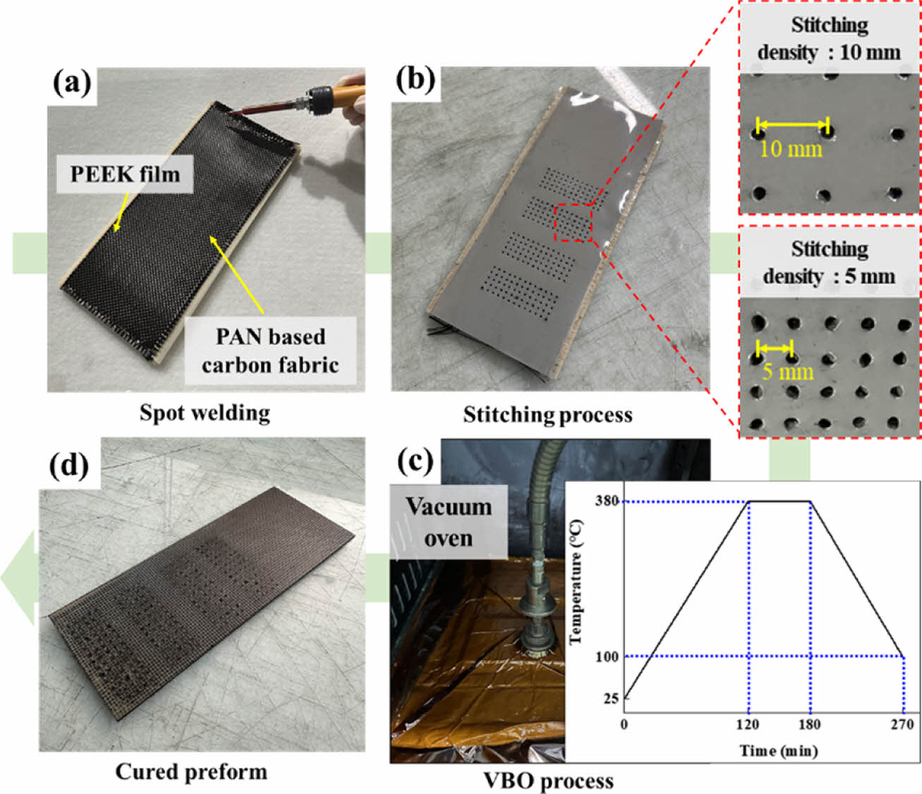 Fig. 3은 고열전도도 열가소성 복합재 제작과정을 나타낸다. 고열전도도 열가소성 복합재를 제작하기 위해 270 mm × 140 mm로 재단한 PAN계 탄소섬유 Dry fabric 12 ply와 270 mm × 150 mm로 재단한 PEEK 필름 13 ply를 교차로 적층 하였다. 적층 과정 중에 Fig. 3(a)와 같이, 탄소섬유와 PEEK 필름의 위치 이탈을 방지하고 형상을 유지하기 위해 가열된 인두를 활용하여 각 ply 간의 점 접합을 수행하였다. Fig. 3(b)에 제시한 점 접합이 완료된 프리폼에 2.2절에서 설명한 스티칭 공정으로 스티칭을 수행하였다. 스티칭이 완료된 프리폼은 Fig. 3(c)에서 확인할 수 있듯이 진공 오븐을 활용한 Vacuum bag only (VBO) 공정으로 상온에서 380oC까지 120분 동안 Heat up 후 90분 동안 수지를 충분히 녹인 후 자연 냉각 사이클로 경화하였다. 경화된 열가소성 복합재를 Fig. 3(d)에 나타내었다.