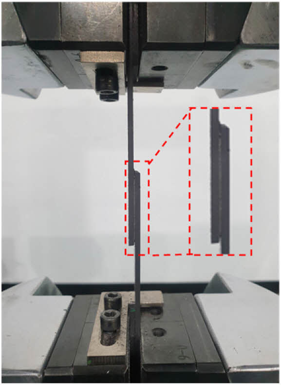 열전도 용접 공정 변수에 따라 용접된 시편의 접합 강도를 측정하기 위해 단일 겹침 전단시험을 Fig. 7과 같이 수행하였다. 단일 겹침 전단 시험은 ASTM D5868[33] 규격을 준용하여 폭 25.4 mm, 길이 177.8 mm로 시편을 준비하였고 MTS E45 재료 시험기를 사용해 13 mm/min의 속도로 하중을 가하였다.