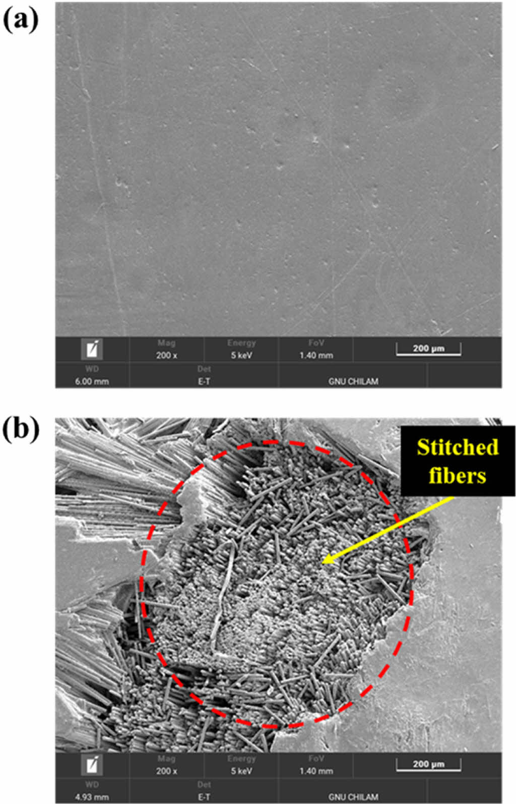 Fig. 9 Scanning electron microscopy (SEM) images of surfaces of (a) Non-stitched specimen and (b) Stitched specimen |