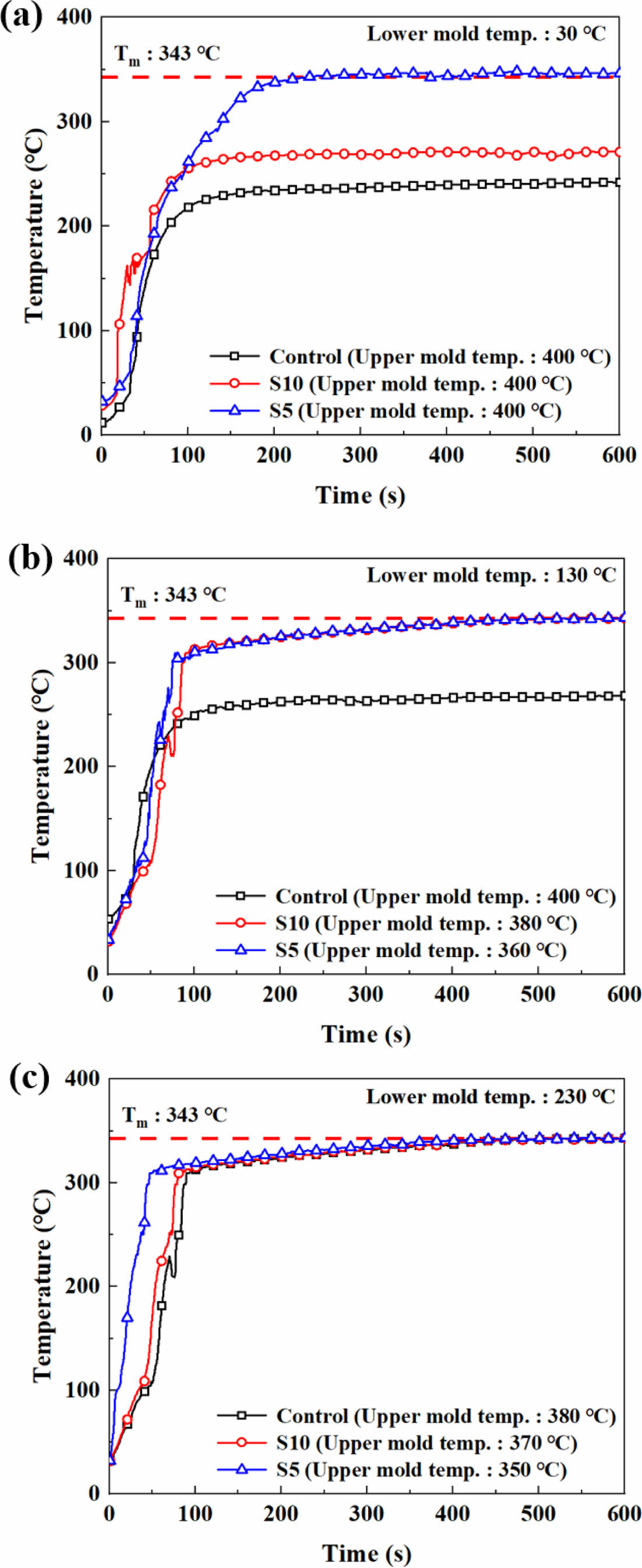 Fig. 10 Temperature profiles at the joint interface during thermal conduction welding under different lower mold temperature conditions: (a) 30°C, (b) 130°C, and (c) 230°C |