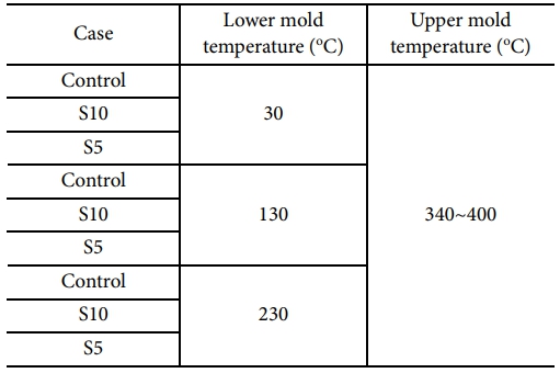 Fig. 10은 열전도 용접 과정에서 상부 금형의 온도를 340oC에서 400oC로 변화시키고, 하부 금형의 온도를 각각 30oC, 130oC, 230oC로 유지했을 때 접합 계면에서의 온도 변화를 나타낸 그래프이며, Fig. 10에서는 모든 시험결과가 아닌 스티칭이 전도용접 효율을 우수하게 증가시킬 수 있다는 점을 확인할 수 있는 결과만 요약하여 제시하였다. 온도측정 결과로부터 동일한 하부 금형 온도 조건에서 스티칭 밀도가 높을수록 PEEK의 용융온도에 도달하기 위해 요구되는 상부 금형 온도가 더 낮았으며, 접합 계면의 온도 상승 속도 또한 빨라지는 경향을 확인할 수 있었다.