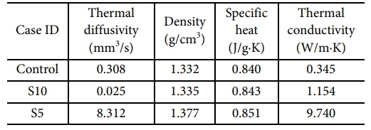 앞선 3.1절에서 언급한 바와 같이, 열전도도는 측정된 열확산도, 비열, 밀도를 바탕으로 계산되었다. Pitch계 탄소섬유 스티칭 밀도에 따른 열가소성 복합재의 열적 물성과 열전도도 측정 결과는 각각 Table 4과 Fig. 8에 각각 나타내었다. 측정 결과, Control 시편의 두께방향 열전도도는 0.345 W/m∙K, S10은 1.154 W/m∙K, S5 시편은 9.740 W/m∙K로 측정되어, 스티칭 밀도가 높아질수록 두께방향의 열전도도가 뚜렷하게 높아지는 경향을 확인할 수 있다. 특히, S5 시편은 Control 시편 대비 2,723.2% 열전도도가 향상되었으며, S10 시편의 843.9%의 값을 나타내었다.
