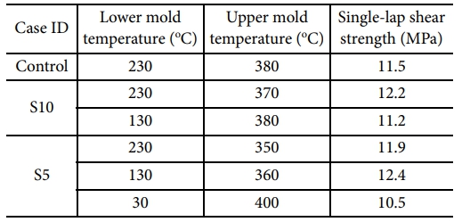 이는 스티칭 밀도가 높을수록 복합재 내부의 열전달 경로가 보다 효율적으로 형성되어, 열전도 용접 중 접합 계면까지 PEEK를 용융시킬 수 있는 충분한 열이 전달되어 용융이 효과적으로 이루어졌기 때문으로 분석된다. 특히, S5 시편은 가장 높은 스티칭 밀도를 갖고 있어 복합재 내부의 열전달 경로가 극대화되어 에너지 전달 효율이 향상되었고, 결과적으로 더 낮은 금형 온도 조건에서도 우수한 접합 품질을 달성할 수 있었다.