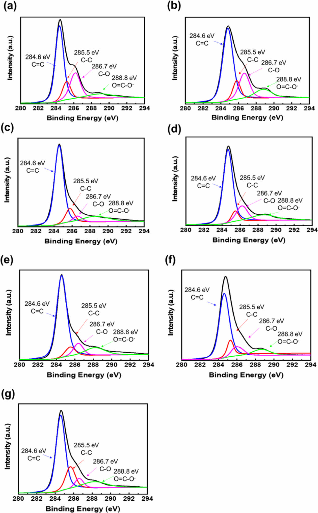 Fig. 3 C1s peak fitting spectra of (a) v-CF, (b) pyrolysis, (c) SCF, (d) SHS, (e) KMnO4, (f) mCPBA, and (g) NaOCl |