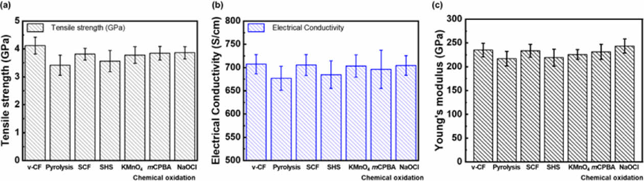 전기 전도도에서도 유사한 경향이 관찰되었다 (Fig. 4b, Table 5). 열분해 및 SHS 처리된 r-CF는 v-CF와 비교했을 때 전기 전도도에서 유의한 차이를 보였으나 (p <0.05), SCF, KMnO4, mCPBA, NaOCl로 처리된 r-CF는 통계적으로 유의미한 차이를 보이지 않았다 (p> 0.05). 이는 과도한 산화 및 열 분해가 기계적 특성뿐 아니라 전도성에도 부정적인 영향을 미친다는 것을 의미한다.