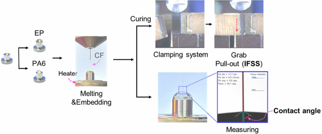 Fig. 6 Schematic illustration of the measurement method for contact angle and interfacial shear strength (IFSS) between resin and r-CF |