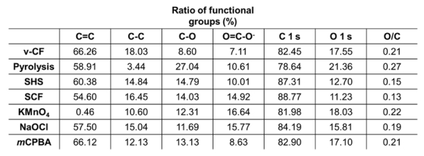 반면, 화학 산화에 의한 r-CF는 보다 제어된 산화를 보였으며, 이온 및 라디칼 산화 메커니즘이 복합적으로 작용한 특성이 나타났다. KMnO4 산화는 O/C 비율을 0.22까지 증가시켰으며, O=C–O 작용기 비율이 16.64%로 높게 나타나 강한 산화력을 가진 과망간산의 효과를 반영하였다. mCPBA 산화는 O/C = 0.21로 중간 정도의 산화를 보였고, C-O (13.13%) 및 O=C–O (8.63%) 작용기의 증가가 관찰되어 에폭사이드 고리의 선택적 개환 및 에스터 형성 반응이 일어났음을 시사한다. NaOCl 산화는 O/C 비율이 0.19로 산소 작용기가 증가하였으며, 이는 C-N 결합의 라디칼 산화적 절단이 발생한 결과이다.