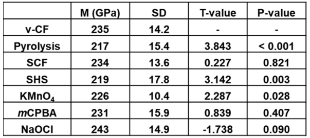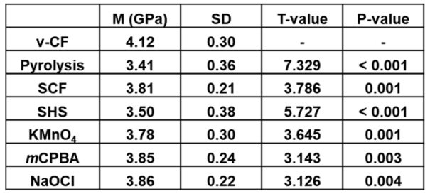 이러한 경향은 통계 분석 결과 (Table 3, Table 4)와도 일치하였다. t-검정 (t-test) 결과, 열분해와 SHS 방법으로 재활용된 r-CF는 v-CF에 비해 인장 강도가 통계적으로 유의미하게 낮은 차이를 보였으며 (p <0.05), SCF 및 화학적 산화법으로 얻어진 r-CF는 유의미한 차이를 보이지 않았다 (p> 0.05).