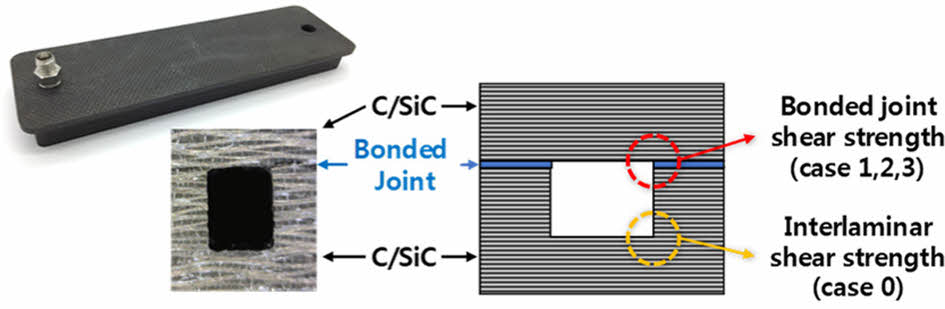 C/SiC 복합소재에 대해 층간전단강도(interlaminar shear strength)를 평가하고 분석한 연구사례는 다수 찾아볼 수 있다[8-11]. 특히 Schulte-Fischedick 등의 연구[11]는 용융실리콘함침(Liquid Silicon Infiltration, LSI) 공정을 통해 제조된 C/C-SiC 복합재의 층간 전단강도에 미치는 열적 섬유 전처리(TFP)의 영향을 분석하였다. 다양한 온도의 TFP를 통해 섬유-매트릭스 계면의 접착력을 조절하고, DNCS(Double Notched Compression Shear) 시험을 통해 층간 전단강도의 변화를 평가하였다. 그러나 내부에 재생냉각 유로를 가지는 CMC 구조체를 제작하는 경우, 필연적으로 두개 이상으로 분할되어 가공된 파트들을 연결하거나 접합하는 공정이 필수적으로 요구된다. 이 경우 동일한 전단응력이 가해지는 경우라도 층간전단강도가 아닌 접합부의 전단강도를 기준으로 평가하여야 한다. 그러나 이와 같이 분할된 파트의 접합으로 제작된 C/SiC의 접합부의 강도를 연구한 사례는 많지 않다.