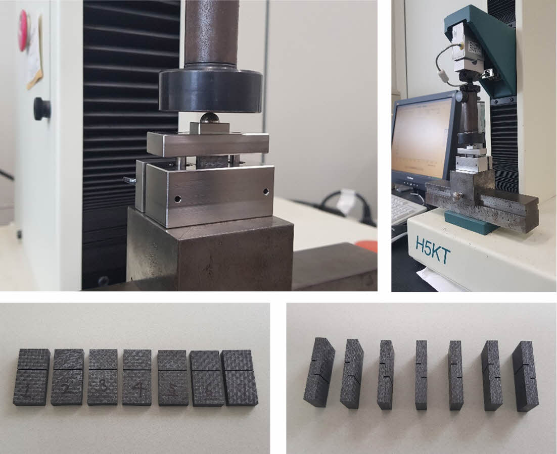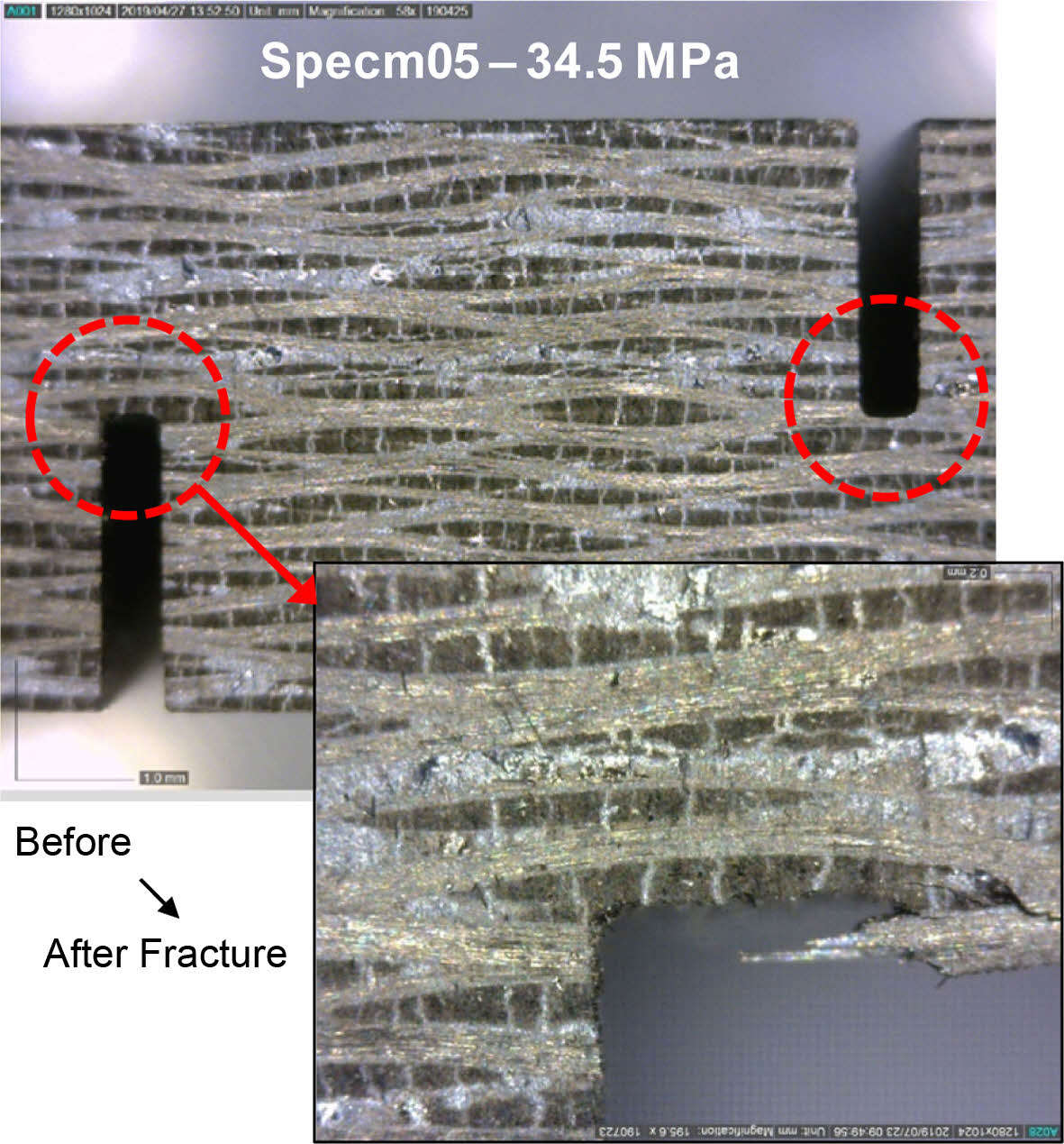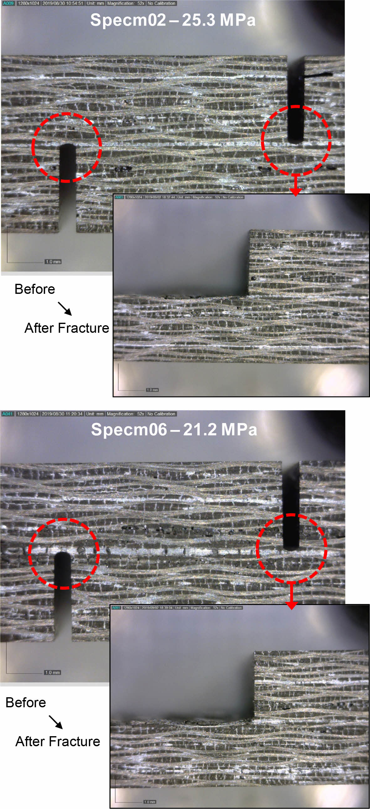 그 중 평균치와 유사한 값을 보인 5번 시편에서 시험 전/후로 파단부의 광학현미경 사진을 비교한 결과를 Fig. 4에 나타내었다. 가공된 노치 끝단에서 시작된 파손이 복합재료 적층면을 따라 진전되다가 이내 적층면의 수직으로 섬유 번들을 통과하는 균열이 형성되는 양상을 확인할 수 있다.