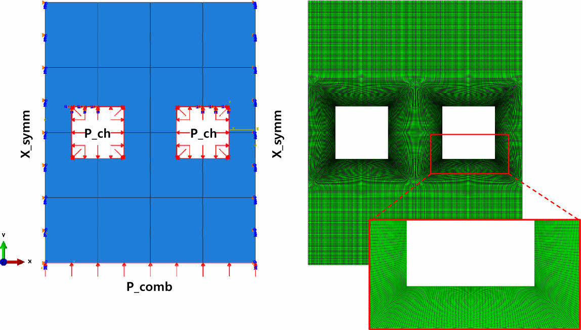 단면의 두께 치수 대비 연소기의 전체는 열 배 이상의 충분히 큰 길이와 폭을 지니므로, 해석의 효율성과 편의성을 위해 2D plane-strain 조건을 부여하고, 해석모델의 좌우로 대칭 경계조건을 모사하였다.