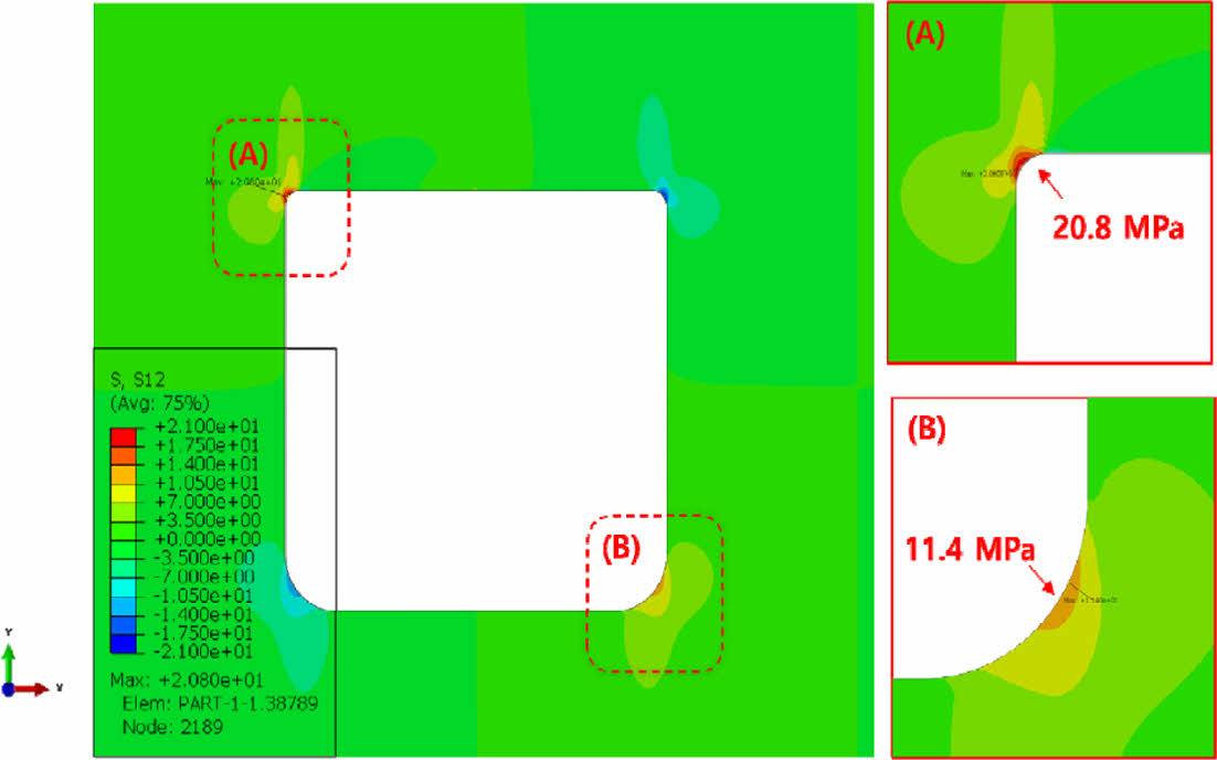본 연구에서는 이와 같이 현미경으로 측정한 3개 유로의 이미지를 토대로 총 12군데 모서리에서의 곡률 반경을 측정하였다. 그 결과를 바탕으로 유로 바닥부 모서리에는 R0.27mm, 상부 모서리에는 R0.09mm의 곡률을 적용한 해석모델을 새롭게 구성하였다(Fig. 10). 수정된 해석모델은 기존의 모델 대비 경계조건 및 하중조건, 요소의 크기 등 모든 조건이 동일하며, 다만 형상 변화로 인해 요소 수가 58,673개로 다소 증가한 차이만 존재한다. 이와 같이 유로 모서리의 곡률을 반영한 해석모델의 구조해석 결과를 Fig. 11에 나타내었다. 곡률이 큰 유로 하부 모서리에서의 최대 전단응력은 11.4 MPa로 완만한 응력분포를 보이며, 곡률이 작은 유로 상부 모서리에서는 더 높은 20.8 MPa의 최대 전단응력이 도출되었다.