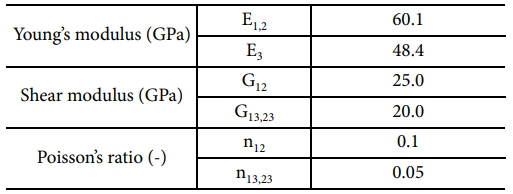 재생냉각을 위한 연료가 흐르는 유로 내부에는 예상 하중조건에 안전계수 2배를 가한 100 bar의 설계압력(P_ch)을 부가하였으며, 연소관 내부 벽면에는 10 bar의 압력(P_comb)을 하중조건으로 적용하였다. 해석모델에서 적용된 C/SiC 소재의 물성 값은 Table 3와 같다.