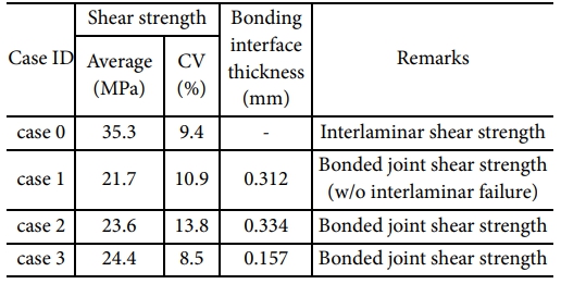 각 case들의 강도 결과와 접합면 두께를 정리하여 Table 4에 나타내었다. case 1의 경우는 노치의 위치에 따라 층간전단 파손 양상을 보인 시편들을 제외한 결과로 나타내었다. 이 중 접합부의 강도를 보여주는 case 1~3 중에서는 case 3의 결과가 가장 전단강도가 높고 편차도 낮음을 알 수 있다. 이는 앞서 파단부 분석에서 본 것과 같이 case 3의 접합면의 두께가 얇고 균일하기 때문이다. 특히 접합면이 얇을수록 파손이 이른 시점에 복합재 층으로 전파되는 양상을 보이고, 이러한 경우에 접합부의 전단강도가 높게 평가되는 결과를 확인할 수 있다.