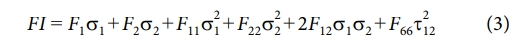 한편, 복합재에 대한 식 (2)의 기준은 개별 응력 성분에 대한 비교만을 고려하며, 다축 응력 상태에서 발생할 수 있는 응력간 상호작용은 고려하지 못한다는 한계가 있다. 이에 따라, 복합재 외피에 대해서는 Tsai-Wu 파괴 기준을 적용하여 보수적인 구조 안정성 평가도 수행하였다. 복합재의 다축 파괴 평가를 위해 널리 사용되는 Tsai-Wu 기준[22]은, 응력 성분간 상호작용을 반영할 수 있는 파괴 이론으로 알려져 있다. 본 연구에서는 다음 식 (3)을 사용하여 파괴 인덱스(FI)를 도출하였다.