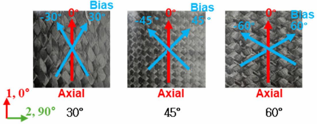 시편은 T700 탄소섬유와 SCI-300R/SCI-300H 에폭시 수지를 사용한 tow-prepreg 기반 삼축 브레이딩 복합재로 제작되었다. 성형에는 RTM(Resin Transfer Molding)이 적용되었으며, 브레이딩 각도는 30°, 45°, 60°로 설정하였다. 성형된 패널은 ASTM 표준 규격에 따라 가공되었다. 인장 시험용 시편은 ASTM-D3039에 준하여 제작되었으며, 전단 시험은 ASTM-D7078 규격에 따라 V-notch를 갖는 직사각형 시편을 사용하였다. Fig. 1은 각 브레이딩 각도에서의 섬유 배향 패턴을 나타낸다.