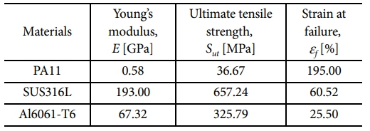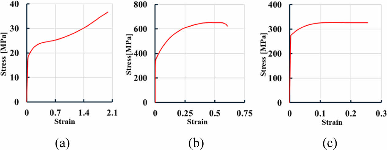 Fig. 6 Stress-Strain curves of (a) PA11, (b) SUS316L, (c) AI6061-T6 |