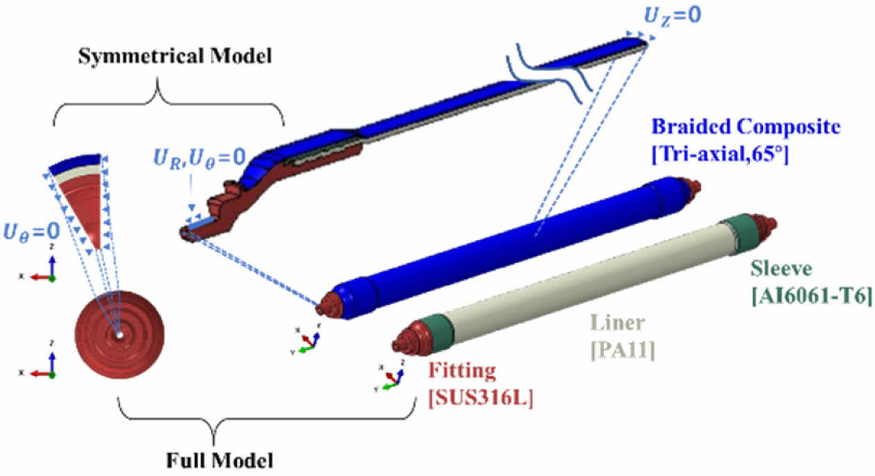 해석 대상 용기는 Type IV 수소압력용기로, 내부에는 PA11 기반 고분자 라이너가 적용되었으며, 피팅과 슬리브는 각각 SUS316L과 Al6061-T6로 구성되어 있다. 외부는 ±65°/0°방향 섬유로 구성된 3축 브레이딩 복합재로, 총 12-ply로 보강되어 있다.