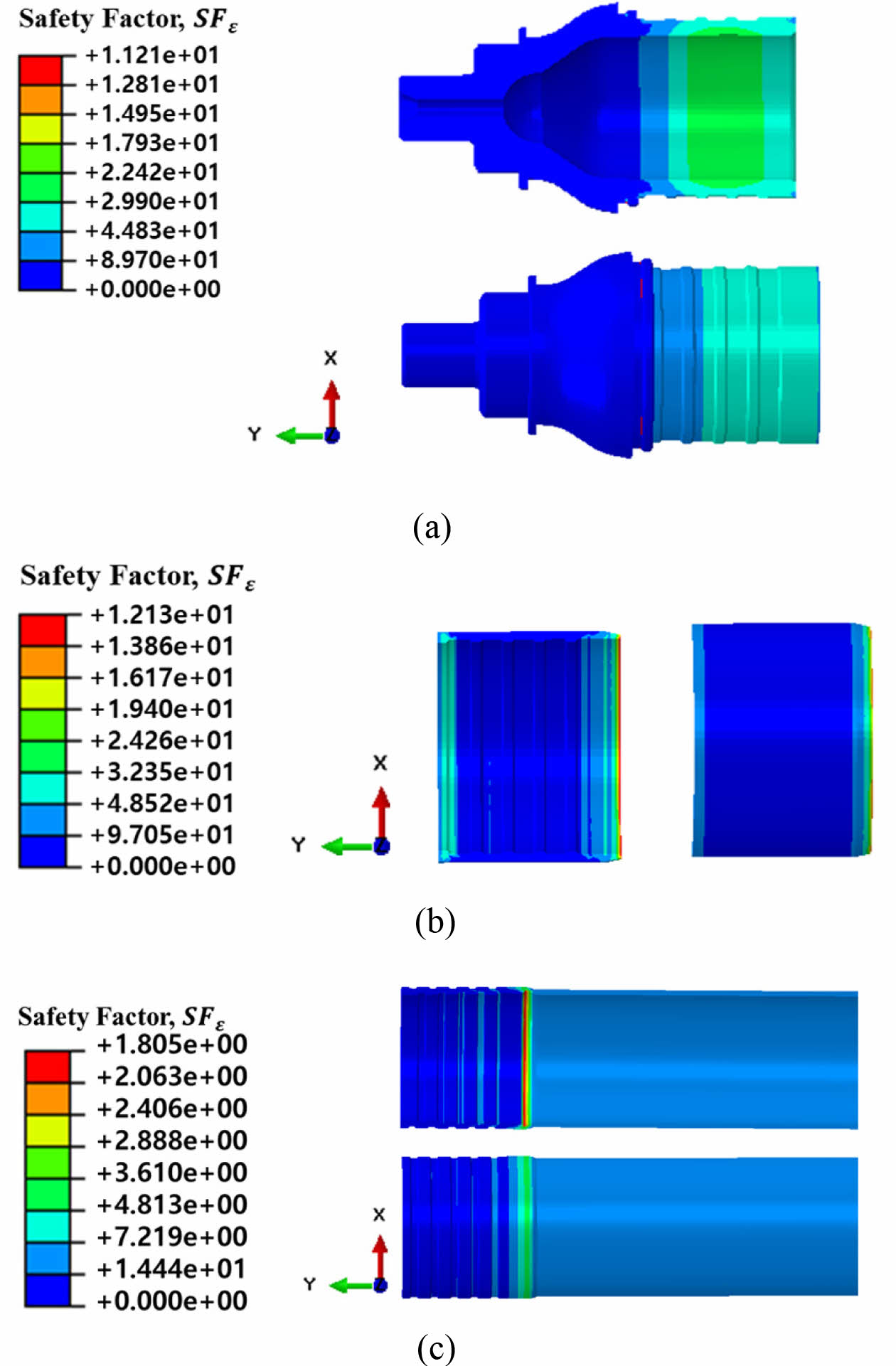 Fig. 9 Safety Factor contour at 157.5 MPa (Baseline model): (a) Fitting, (b) Sleeve, (c) Liner |
