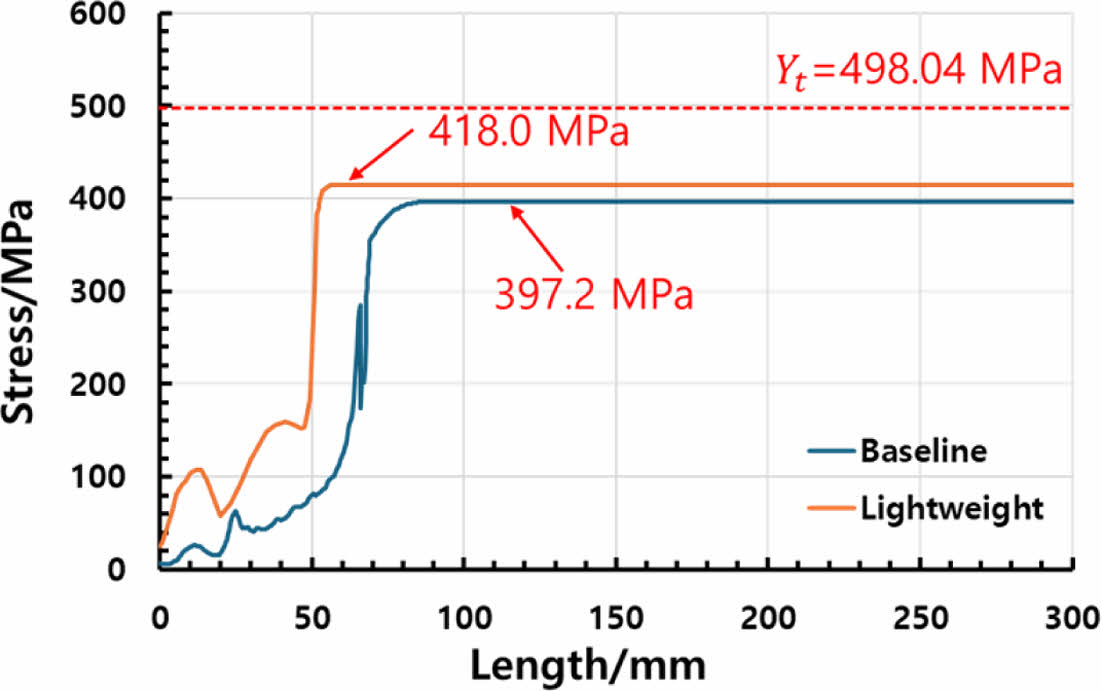 복합재 외피에 대한 구조 안정성 평가는 축방향(1-dir.)과 hoop 방향(2-dir.)의 두 응력 성분에 대해 각각 진행하였다. 전단 응력 성분은 해석 결과에서 매우 낮은 값을 보여 구조 안정성에 끼치는 영향이 미미한 것으로 판단되어 방향별 구조 안전성 평가에서 제외하였다. 분석 결과는 Fig. 11~12에 도시되어 있으며, 이는 최소 파열압 조건(157.5 MPa) 하에서 외피 표면을 따라 측정된 축방향 및 hoop 응력의 길이 방향 분포를 나타낸다. 두 그림에는 Baseline 및 Lightweight 모델 각각에 대한 응력 분포가 포함되어 있어, 응력 집중의 위치와 크기를 정량적으로 비교할 수 있다.