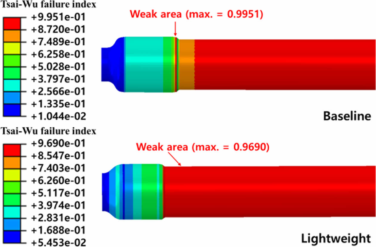 두 모델에 대해 Tsai-Wu 파괴 기준식을 적용하여 파괴 인덱스를 산정한 결과, Fig. 13에 도시된 바와 같이 전체 영역에서 FI는 모두 1 미만으로 유지되었다. 특히 Baseline 모델은 최대값이 0.99로 파단 임계값에 근접한 반면, Lightweight 모델은 0.97로 보다 안정적인 결과를 나타내어, 응력 성분 간 상호작용을 고려한 보수적 평가 기준에서도 Lightweight 모델이 상대적으로 유리한 구조적 특성을 보임을 확인할 수 있다.