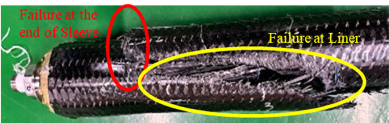 유한요소 해석 결과의 신뢰성을 검증하기 위해 Baseline 모델을 대상으로 파열 시험을 수행하였다. 실험 결과, 파열압은 173.36 MPa로 측정되었으며, 모든 시편에서 파손은 Fig. 14과 같이 동체(라이너)부 파열 형태로 진행되었다.