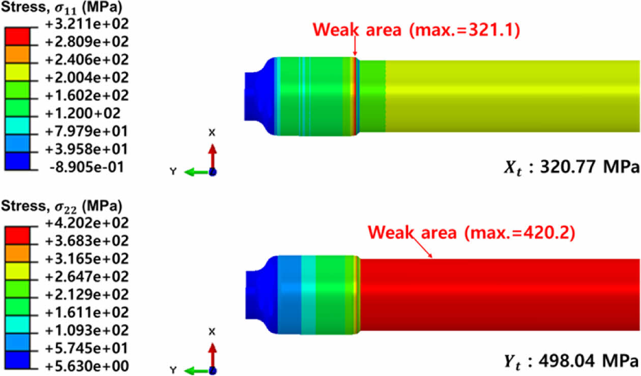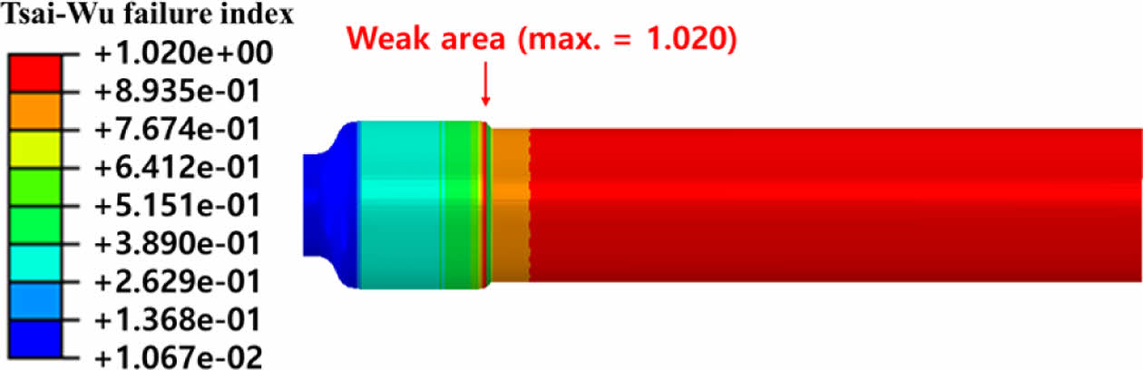유한요소 해석에서는 Fig. 15와 같이 내부 압력을 166.5 MPa로 증가시켰을 때 복합재 외피에서 허용 강도를 초과하는 응력이 처음으로 발생하였다. 이 과응력(overstress)영역은 라이너-슬리브 경계 부위로부터 시작되며, 이는 Fig. 13과 같이 실험에서 관찰된 파손 부위와 정확히 일치하였다. 예측된 파열압(166.5 MPa)은 실험값(173.3 MPa)에 대해 약 3.9%의 오차 범위를 가지며, 이는 수치 해석의 신뢰도를 뒷받침한다. 한편, Tsai-Wu 파괴 기준을 적용한 경우, Fig. 16과 같이 내부 압력이 161 MPa에 도달했을 때 FI가 1을 초과하였으며, 이는 최대 응력 기준보다 다소 보수적인 예측이지만 실험에서 관찰된 파손 위치와 동일한 결과를 재현하였다. 이러한 결과는, 본 연구의 유한요소 해석 모델이 단순한 구조 응답 예측을 넘어 파열 위치와 파괴 형태까지 정량적으로 예측할 수 있음을 입증한다.
