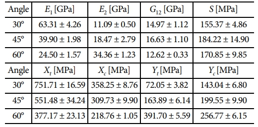 시험 결과, 브레이딩 각도의 변화에 따라 기계적 물성이 뚜렷하게 변화하는 양상이 관찰되었다. 30°브레이딩 시편은 섬유 배향이 0°하중 방향과 가까우므로 E1 및 Xt, Xc값이 가장 높았으며, 횡방향에서는 낮은 성능을 보였다. 반면 60°시편은 바이어스 섬유가 횡방향 응력 전달에 기여하여 E2 및 Yt,Yc에서 가장 높은 값을 나타냈다. 45°시편은 그 중간 수준의 값을 나타냈으며, 전단 강성(G12)과 전단 강도(S)에서는 상대적으로 가장 높은 수치를 기록하였다.