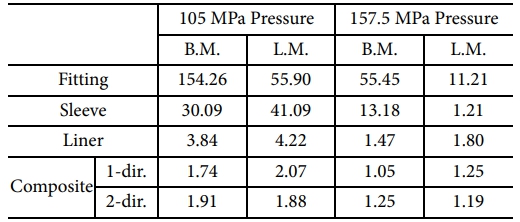 하중 조건은 다음 두 가지 내압 조건에서 구조 응답을 비교하였다. 첫번째 조건은 내압 성능 평가용 하중 조건으로, 사용압력(70 MPa)의 1.5배에 해당하는 105 MPa을 적용하였다. 두번째는 EU 406/2010[20] 및 EC 79[21] 규정에 따라 탄소섬유 복합재 압력용기에 요구되는 최소 파열압 기준을 반영한 것으로, 사용압력의 2.25배에 해당하는 157.5 MPa의 하중을 적용하였다. Fig. 8