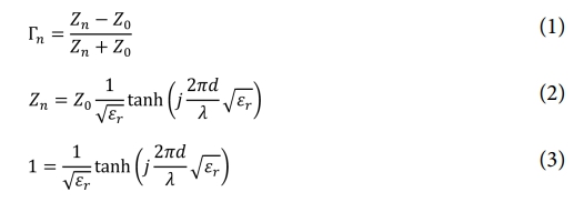 RAS 표면에서는 전파의 반사와 투과가 동시에 발생하며, 이 전파가 반사, 투과 또는 흡수층에서 소실되는 양은 RAS 흡수층의 전자기적 특성과 두께에 따라 달라진다[26]. 전파의 흡수량을 증가시키면서 RAS의 두께를 줄이기 위해서는 흡수층의 복소 유전율을 높이는 것이 필요하지만 무조건적인 유전율의 상승은 표면에서 반사되는 전파의 양이 증가시켜 RAS의 성능이 저하될 수 있다. 이에 따라 RAS는 표면에서 발생하는 반사파의 크기를 최소화하여 더 많은 전파가 투과되도록 설계된다. RAS 표면에서 반사파의 크기는 식 (1)에 따라 계산된 반사계수를 통해 평가할 수 있다. 일반적으로 전파의 수직 입사 조건에서 반사계수의 절대값이 최소가 되기 위해선, 입력 임피던스(Zn)가 자유공간의 특성 임피던스(Z0 = 377 Ω)와 일치해야 한다. 이때 반사계수는 0이 되며 이러한 상태를 임피던스 정합이라고 한다[27]. 본 연구에서는 평면 입사 전자기파가 자유공간을 통해 전파흡수구조에 수직으로 입사하는 경우를 고려하여 RAS를 설계하였다. Fig. 10과 같은 단층형 RAS에서 후면의 금속판의 특성 임피던스는 0이며 유전성 전파흡수재료를 사용하였기 때문에 비투자율(μr)은 1이다. 입력 임피던스는 전송선로 이론에 따라 계산되며 수직 입사에 대한 단층형 RAS에서의 계산식은 식 (2)과 같다.