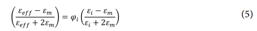 이 식에서 εm은 에폭시 레진의 유전율,εi는 포함된 입자의 유전율, φi는 수분의 부피 비율을 나타낸다. 주파수 10 GHz에서 수분의 상대 유전율은 약 80으로, 에폭시 레진의 유전율인 약 3~4에 비해 매우 높다. 이로 인해 복합재 내부에 수분이 흡수되면, 수분의 높은 유전율로 인해 복합재의 유효 유전율이 상승하게 된다.