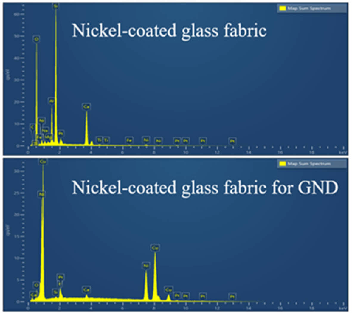 본 연구에서는 유전체로 활용할 수 있도록 니켈이 도금된 유리섬유(Nickel coated glass fiber, NCF)와 GND로 사용할 수 있도록 니켈이 비교적 다량 도금된 유리섬유(Nickel coated glass fiber for GND, GND)를 사용하여 시편을 제작하였다. 유리섬유에 도금된 니켈의 정도를 비교하기 위해서 Fig. 1과 Fig. 2와 같이 주사전자현미경(Scanning electron microscope, SEM) 통해 이미지를 분석하였다. 니켈의 질량 백분율 차이를 에너지 분산형 분광분석법(Energy dispersive spectroscopy, EDS)을 통해 분석하여 Table 1에 나타내었다. 분석 결과 GND용 NCF의 니켈 질량 백분율 은 유전체용 NCF의 질량 백분율 대비 약 21배인 것을 확인하였다. 특히 GND용 NCF에서 구리 성분 또한 다량 검출되었음을 확인하였다. 이는 전기전도도 개선을 목적으로 니켈과 구리를 혼합하여 무전해도금을 진행한 결과이다. 일반적으로 니켈 단일 무전해도금에 비해 구리를 함께 도금할 경우, 전기전도도가 향상되는 것으로 알려져 있으며, 이는 전파 반사 성능을 극대화하기 위한 설계 고려 사항이었다[23]. 복합재 시편 제작에 사용된 에폭시 레진은 diglycidyl ether of bisphenol A 계열(YD-128, 국도화학(주))을 사용하였으며 경화제로는 aromatic amine 계열(TH-431, 국도화학(주))이 사용되었다.