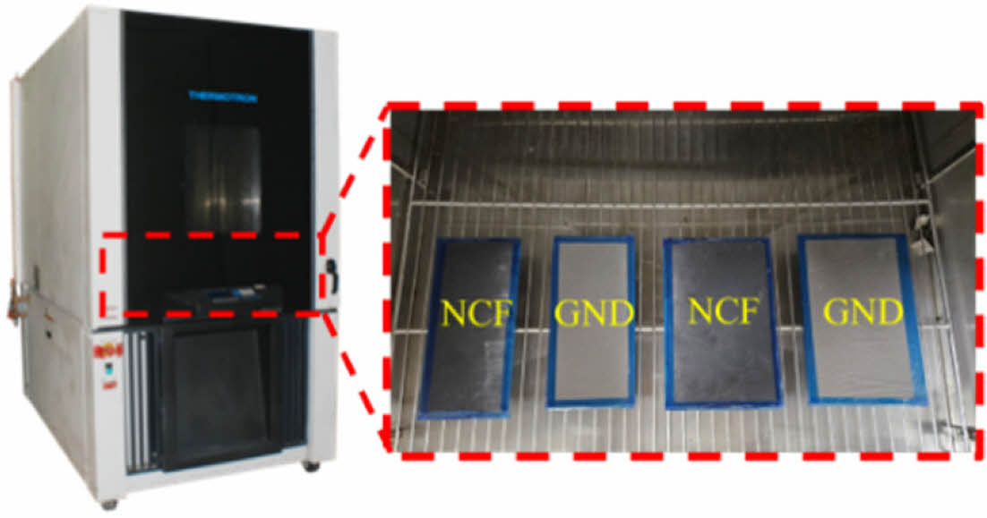 Fig. 4는 본 연구에서 사용한 항온항습기와 내환경시험에 대한 규격이다. 고습도 환경에 따른 기계적 물성 거동을 평가하기 위한 시편은 면내 방향으로 흡습을 유도하기 위해 시편의 끝부분에 고무테이프를 부착하여 단면을 통한 수분 흡수를 차단하였다. 수분 환경에 노출되는 시편은 항온항습기 내에 95%의 수분 환경을 유지한 상태로, 30oC에서 2시간 동안 온도를 60oC로 올린 뒤, 6시간 동안 온도를 유지, 이후 8시간 동안 온도를 30oC로 낮춘 뒤 8시간 동안 유지하였다. Fig. 5는 MIL-STD-810H의 Procedure II-METHOD 507.6의 한 주기 사이클을 나타내며, 해당 시험 규격에서 명시한 5 사이클에서의 기능점검 시점을 준용하여 5일 동안 시험을 진행하였다.