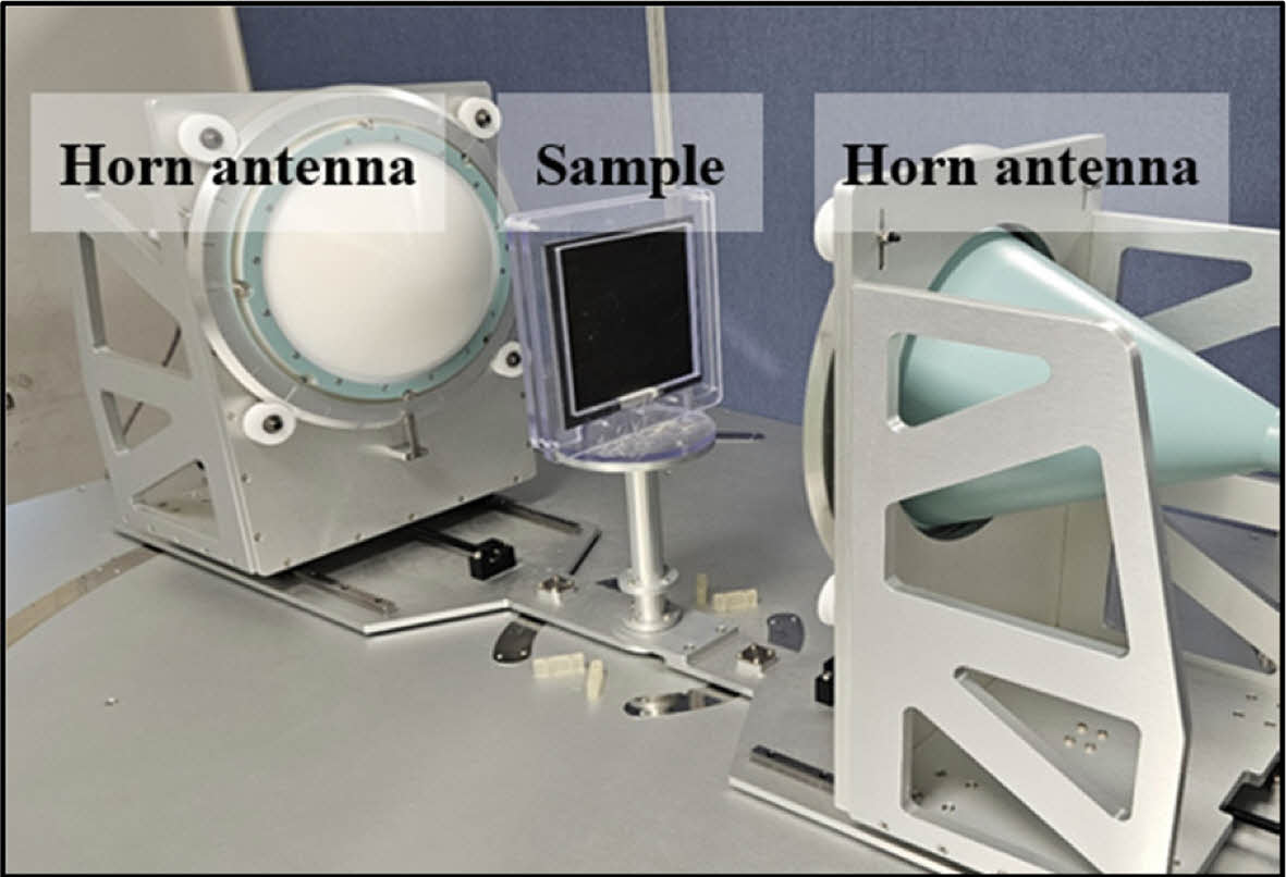 내환경 시험 전, 후 유전체용 NCF 시편 유전율과 GND용 NCF 시편의 반사성능을 자유공간측정장비를 통해 측정하였으며, WOLFGANG 社의 SRM-200 장비를 통해 GND용 NCF 시편의 면저항을 측정하였다. 제작된 유전체용 NCF 시편과 GND용 NCF 시편의 전자기적 물성과 RAS의 전파흡수성능을 내환경시험 전, 후로 Fig. 9에 나타난 자유 공간 측정 장비를 통해 측정하였다. 이 시스템은 두 개의 혼 안테나, 네트워크 분석기, 시편 거치대로 구성되어 있다. 혼 안테나의 전면에 부착된 집속 렌즈는 집속된 빔을 유도하고, 중심에서 시편에 평면파가 3λ (파장) 반경으로 입사되었다. RAS의 전파흡수성능을 측정하기 위해 유전체용 NCF 시편의 후면에 GND용 NCF 시편을 배치하였다. RAS는 두 안테나 사이의 시편 거치대에 배치되었으며, 내환경시험 전, 후로 그 결과를 분석하였다.