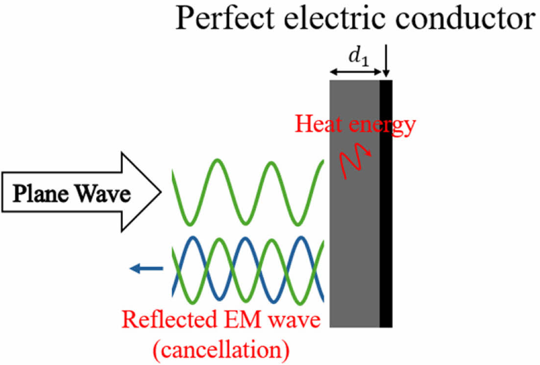 본 연구에서는 NCF 흡수층과 후면에는 GND용 NCF로 구성된 단층형 달렌바흐 흡수체를 Fig. 12(a)와 같이 설계하였다. 전자기파가 RAS에 입사하면, 일부는 표면에서 반사되고, 다른 일부는 유전체용 NCF를 통해 전달된다. 전달된 전자기파 중 일부는 열에너지로 변환되고 나머지는 후면의 GND용 NCF로부터 반사된다. 이때 전달되는 전자기파는 표면 반사파와 서로 공명현상을 일으켜 전자기파를 상쇄시킨다[29].
