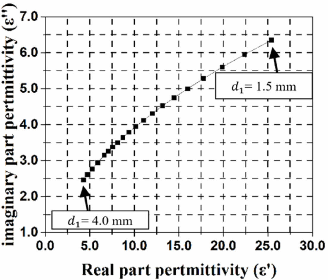 특정 주파수에서 전파흡수구조가 무반사가 되는 조건은 입력 임피던스(Zn)이 공기 중 임피던스(Z0 = 377 Ω)와 동일할 때 성립한다. 따라서 전파흡수구조가 이 무반사 조건을 충족하면 식 (2)는 식 (3)으로 표현된다. 식 (3)에서는 주파수와 두께가 주어졌을 때, 무반사 조건을 만족하는 복소유전율 값을 얻을 수 있다. 주파수 10 GHz에서 전파 흡수층의 두께를 0.1 mm씩 변화시켜 가며 각 두께에서 복소유전율 εr의 해를 구하였다. 복소유전율의 실수부(εr')와 허수부(εr'')를 각각 x축과 y축에 나타내어 cole-cole plot으로 표현하면 Fig. 11과 같다[28].