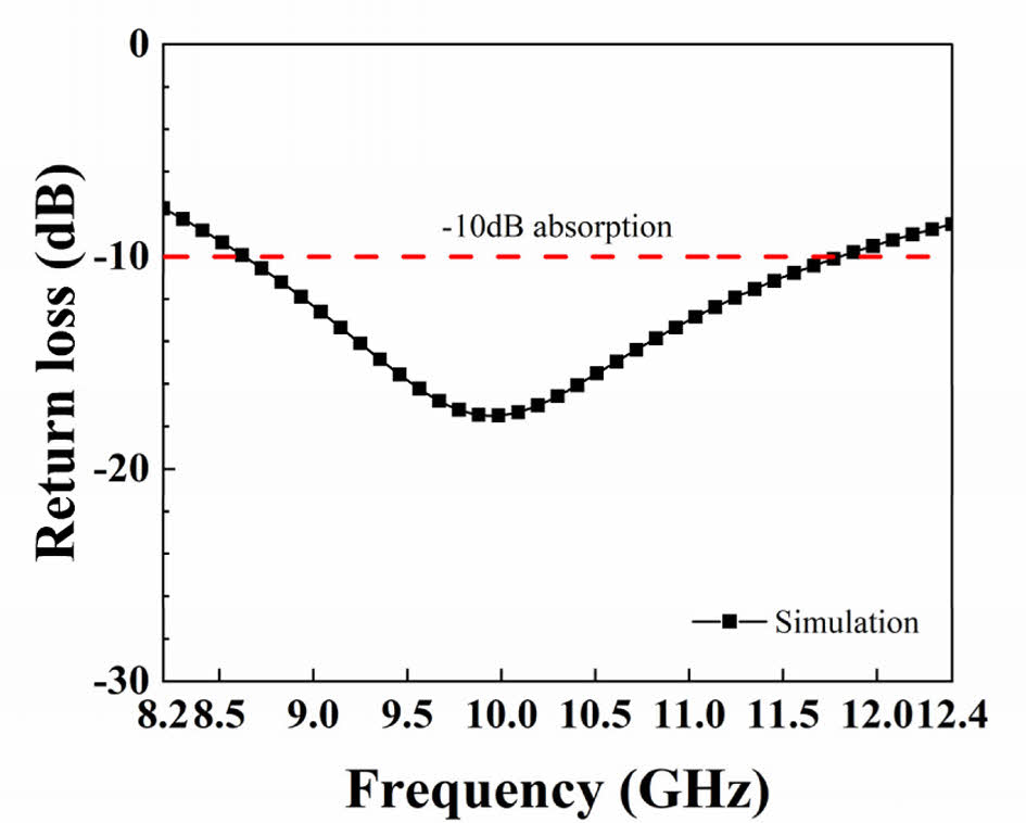 Fig. 12(b)은 상용소프트웨어인 CST Microwave Studio로 설계한 단층형 전파흡수체의 단위 셀 모델이다. RAS는 본 연구에서 측정한 주파수 대역에서 높은 흡수 성능을 나타내도록 두께에 대한 최적화를 통해 RAS를 설계하였으며 이 때 유전체용 NCF 층의 두께는(d1) 2.9 mm로 도출되었다. 이의 시뮬레이션 결과는 Fig. 13에 나타내었다.