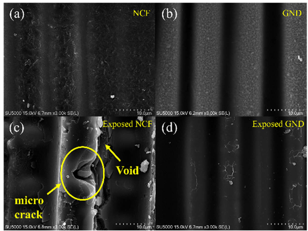 수분 흡수가 시편의 미세 구조에 미치는 영향을 확인하기 위해, Fig. 15에 나타난 바와 같이 시편의 표면과 단면의 SEM 이미지를 촬영하였다. 그러나 수분이 포함되어 있는 시편의 SEM 이미지 촬영이 제한되기 때문에 시편은 항온항습기에서 50%의 상대습도, 23oC의 환경에서 24시간이 넘지 않도록 안정화 과정을 진행하였다. SEM 이미지 분석 결과, 수분 흡수 후 유전체용 NCF 시편의 표면에서 미세 균열이 발생하였으며 GND용 NCF 시편은 미세 공극과 균열이 발생하지 않았다. 이러한 결과는 유전체용 NCF 시편과 GND용 NCF 시편의 고온다습한 환경에서 시험 전, 후 기계적 물성 거동에서 다른 경향을 만들어 냈다.