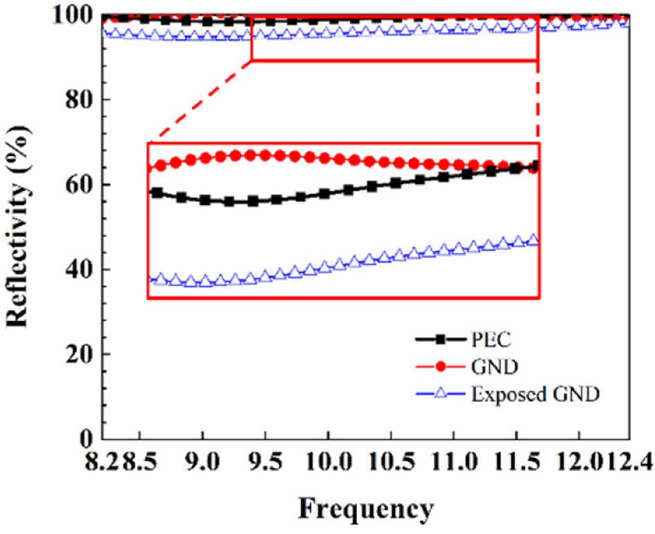 Fig. 19은 내환경시험 전, 후 GND용 NCF와 완전 전기 도체(Perfect electric conductor, PEC)의 반사 성능을 나타내었다. 이때 반사율은 반사계수(Γ)의 제곱으로 반사손실과 반사계수와의 관계 식을 통해 구하였으며 관계식은 식 (4)에 나타내었다. 시험 전 GND용 NCF와 PEC는 서로 상응한 결과를 나타내었으며 시험 후 GND용 NCF의 반사 성능 또한 측정한 주파수 대역 전 구간에 걸쳐 95% 이상의 반사 성능을 보였다. 이러한 결과는 자유공간측정장비를 통한 전자기적 물성 측정과 SEM 이미지 분석을 통해 예상된 결과이다.