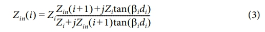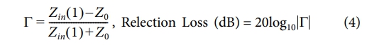 i =n, n-1, ..., 1 순서로 식 (3)을 반복 적용하여, 각 층의 두께 di, 특성 임피던스 Zi, 파수 βi를 대입하여 최종 입력 임피던스인 Zin(1)이 자유공간과 경계를 하는 전체 다층구조의 입력 임피던스가 된다. 이렇게 구해진 입력 임피던스와 자유공간의 임피던스(Z0)를 비교하여 입력 임피던스가 충분히 낮아지면 입사면에서의 반사가 줄어 반사 손실이 낮게 나타나고 이는 식 (4)로 정의된다.