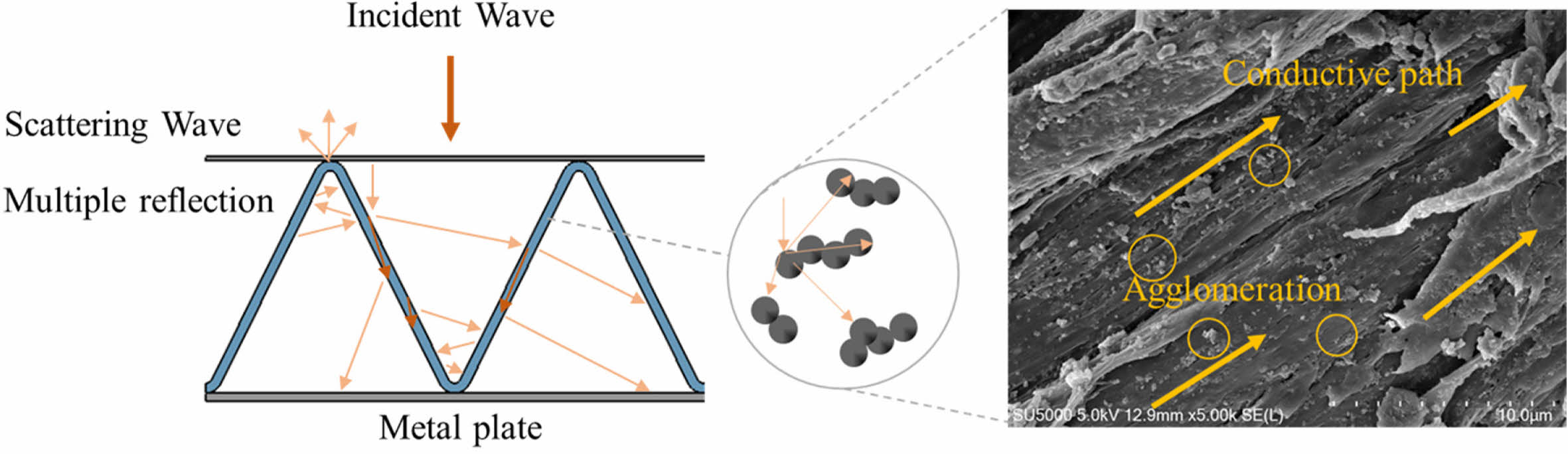 본 연구에서는 카본블랙(Carbon Black, CB)이 분산된 PLA를 코어 재료로 하는 코러게이트 코어 샌드위치 전파흡수구조를 FDM 방식의 3D 프린팅 공정을 통해 제작하고 전파흡수 성능을 평가하였다. Fig. 1에서는 본 연구에서 제안하는 코러게이트 코어 샌드위치 구조의 전파흡수 방식 및 적층 방식의 3D 프린팅으로 형성된 나노 입자의 전도성 경로에 대한 그림으로 제안된 구조 및 마이크로 스케일에서의 전파 흡수 거동을 나타낸다. 굽힘 시험으로 확인한 기계적 거동을 바탕으로 카본블랙 함량에 대한 물성 변화를 분석하였다. 본 연구를 통해 전투기나 무인기 등에서 복잡한 형상 부위나 파손 영역에 3D 프린팅 기반 전파흡수구조를 적용함으로써 경령화와 스텔스 성능을 동시에 달성할 수 있는 효율적 접근 방안을 제시하고자 한다.