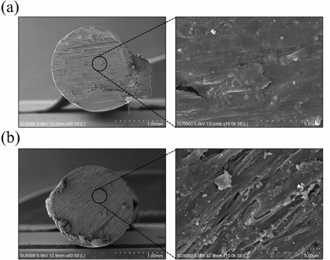 Fig. 2 SEM analysis of (a) PLA filaments, (b) PLA/CB filaments |